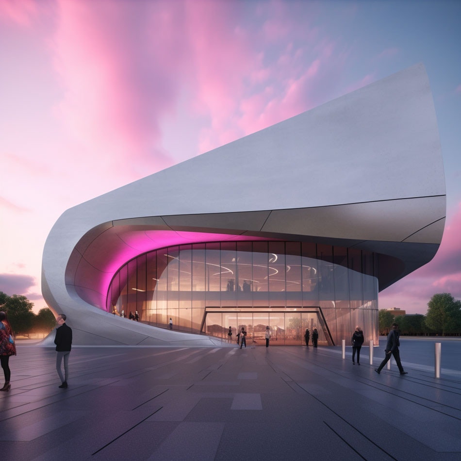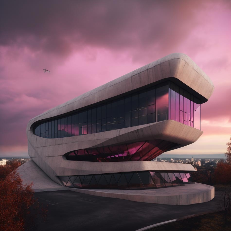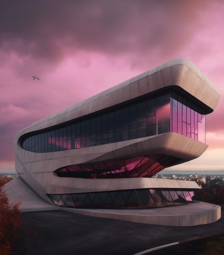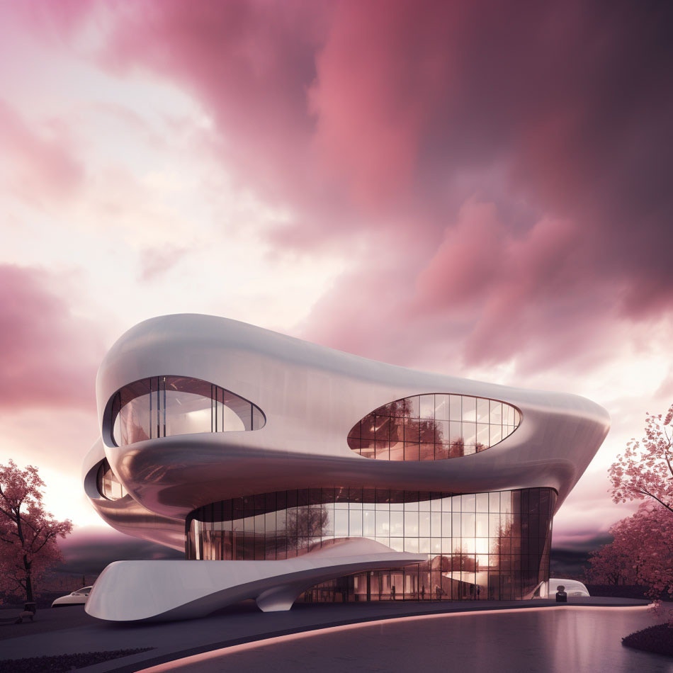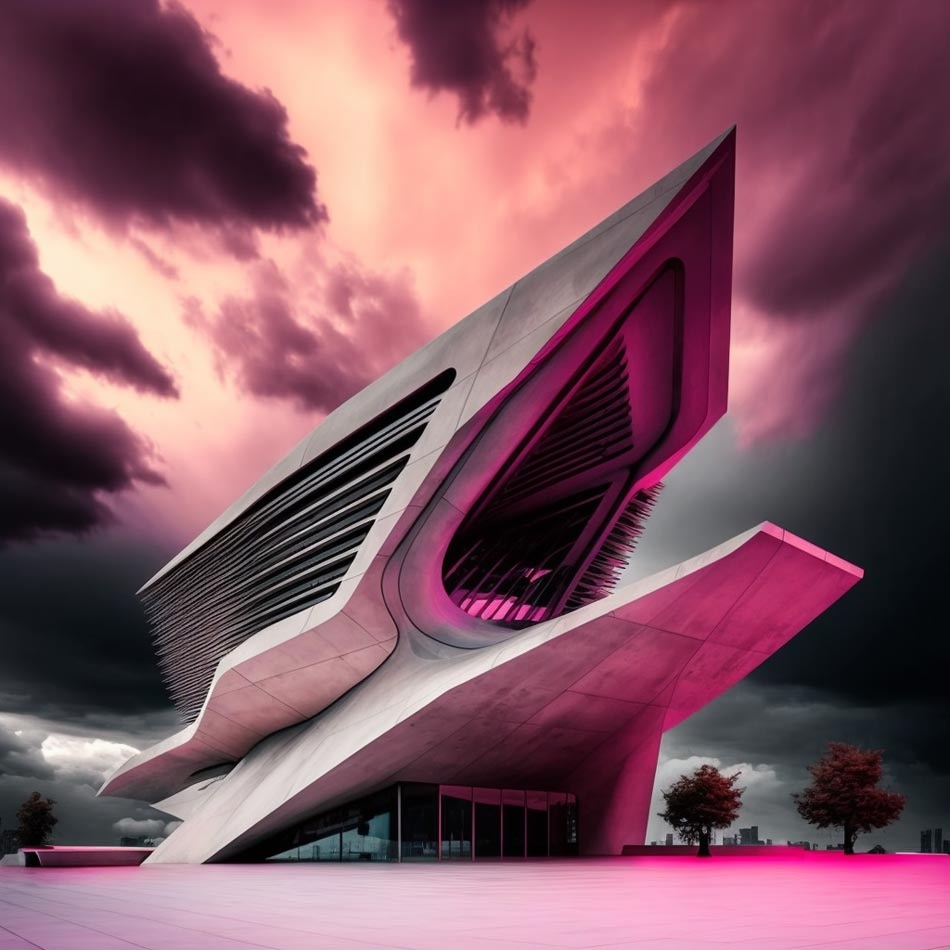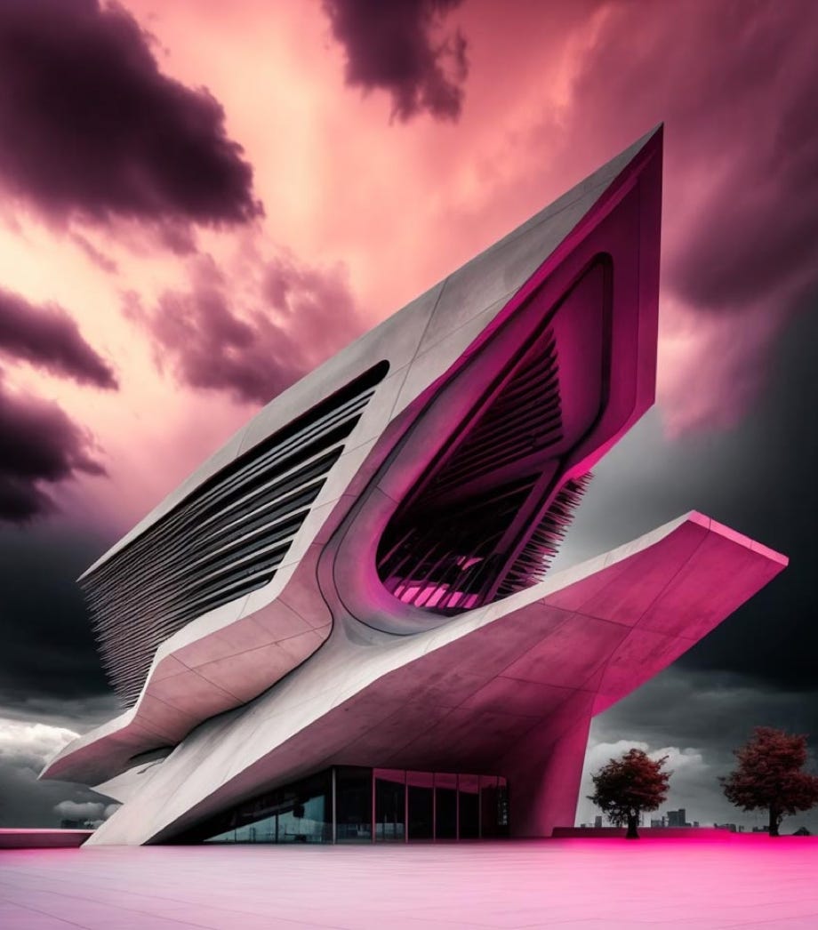 prompt: architectur design, zaha hadid style, maxx museum viewing a city, dramatic pink clouds in the sky, sony camera, award winning photo, magazin photograph, 50mm with 2.8, perfect lighting at day –v 5 @Subraum-01 (fast)