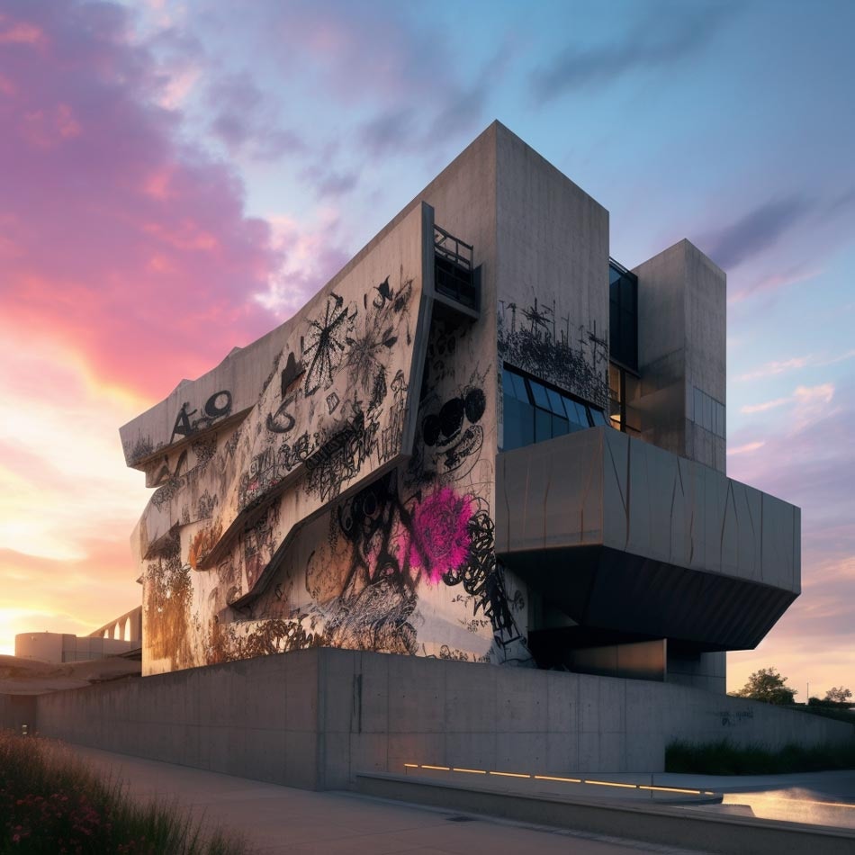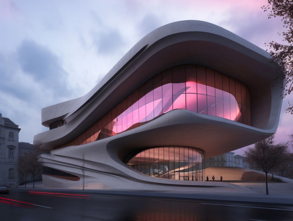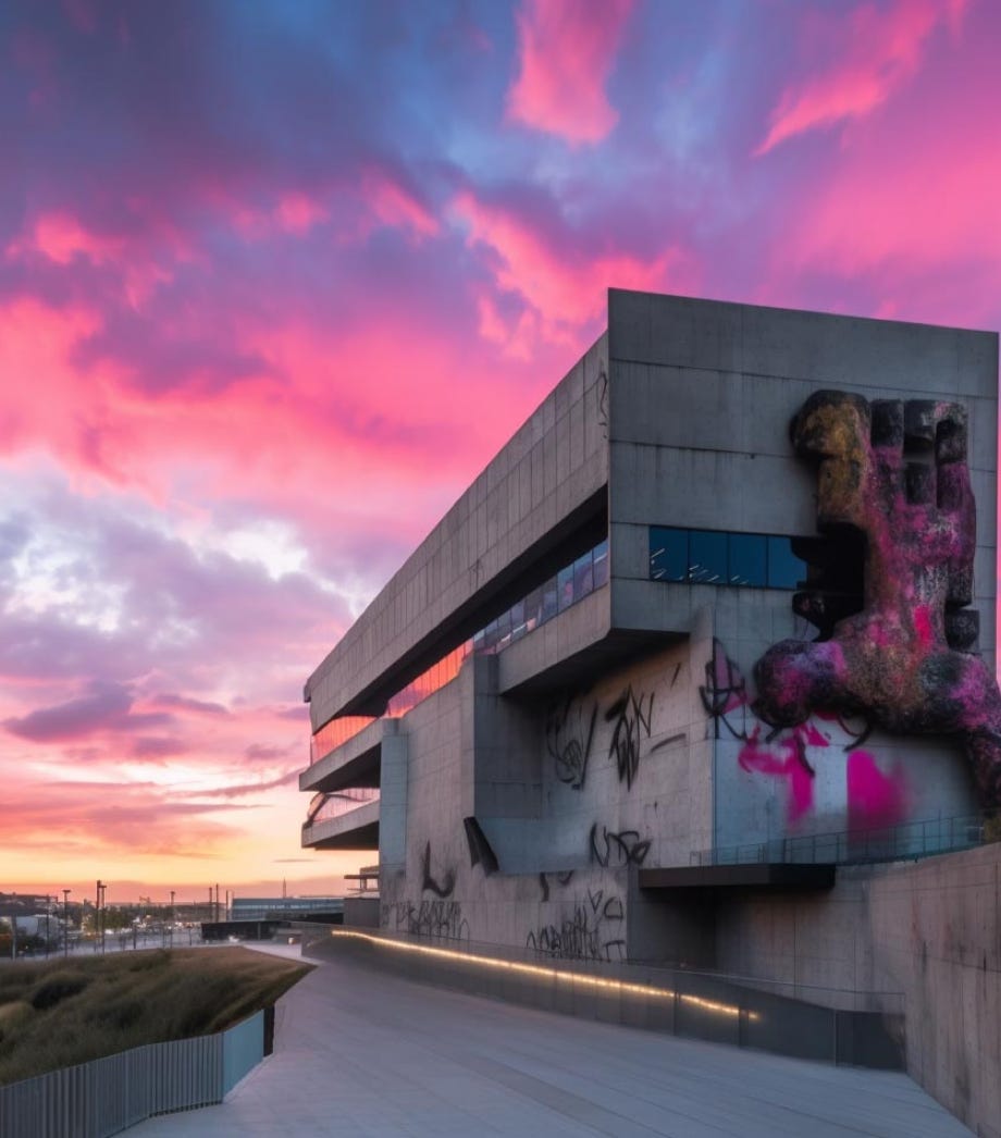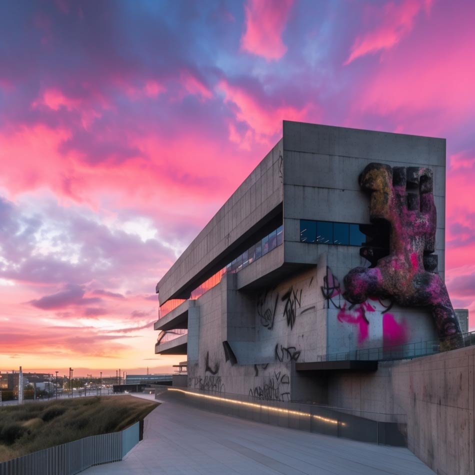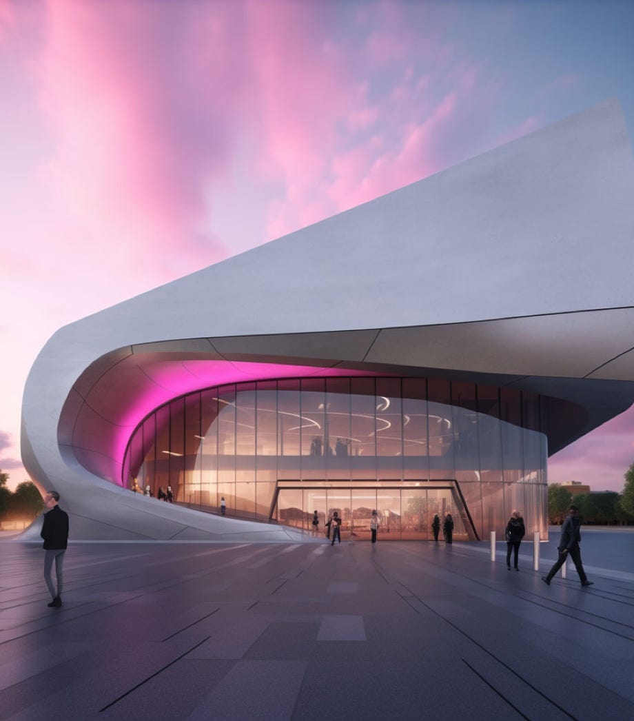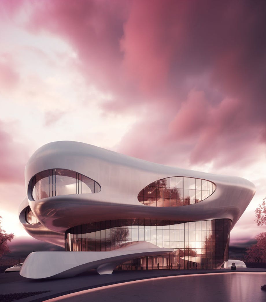 prompt: architectur design, zaha hadid style, maxx museum viewing a city, dramatic pink clouds in the sky, sony camera, award winning photo, magazin photograph, 50mm with 2.8, perfect lighting at day –v 5 @Subraum-01 (fast)