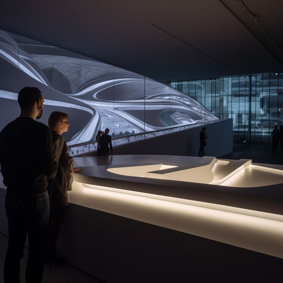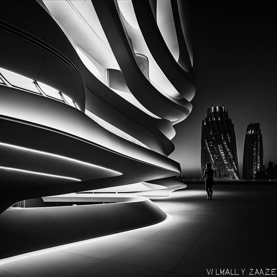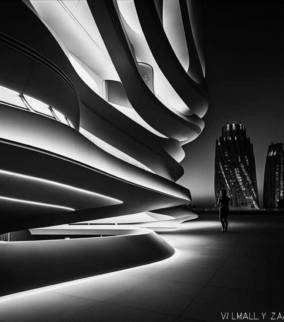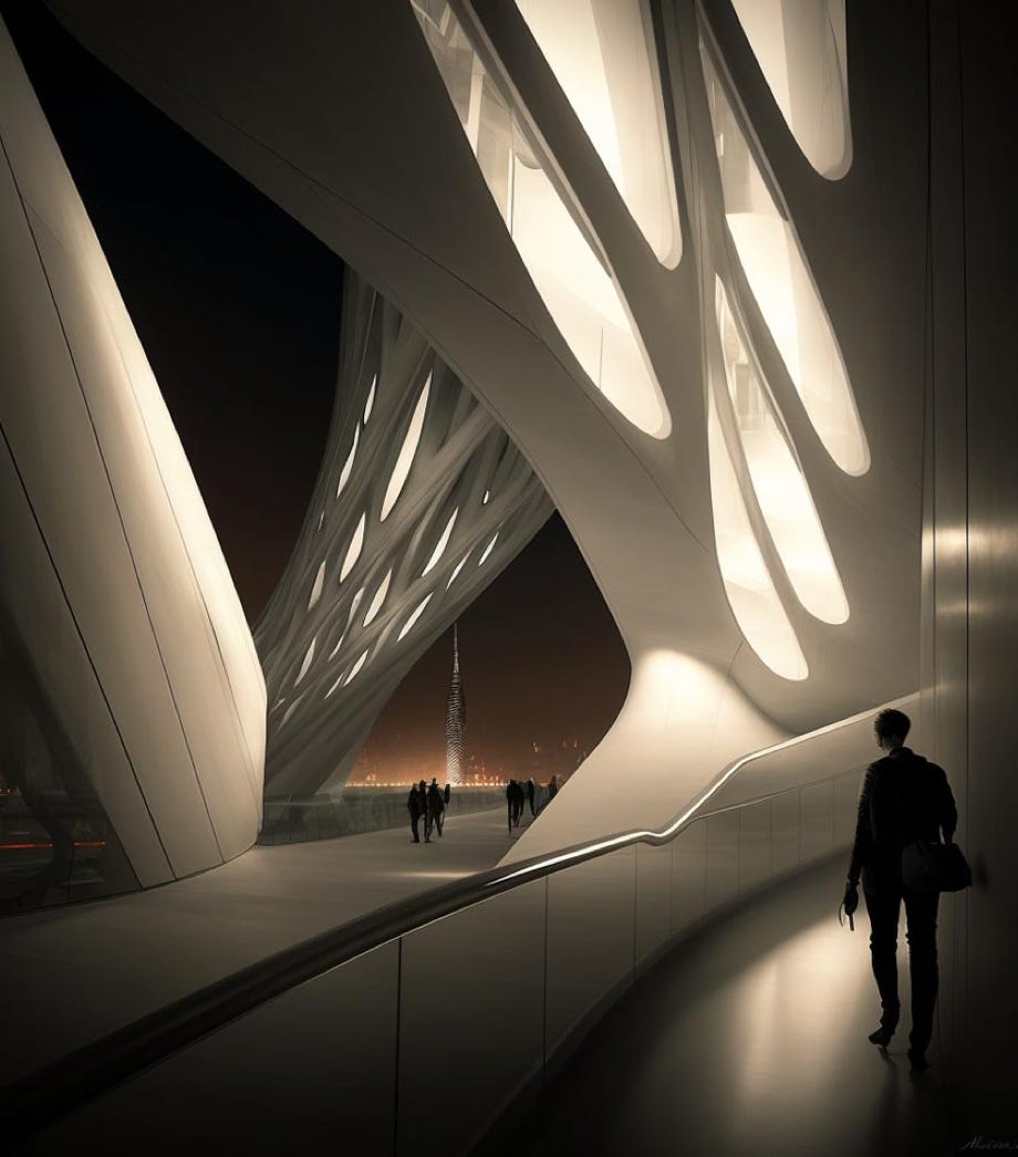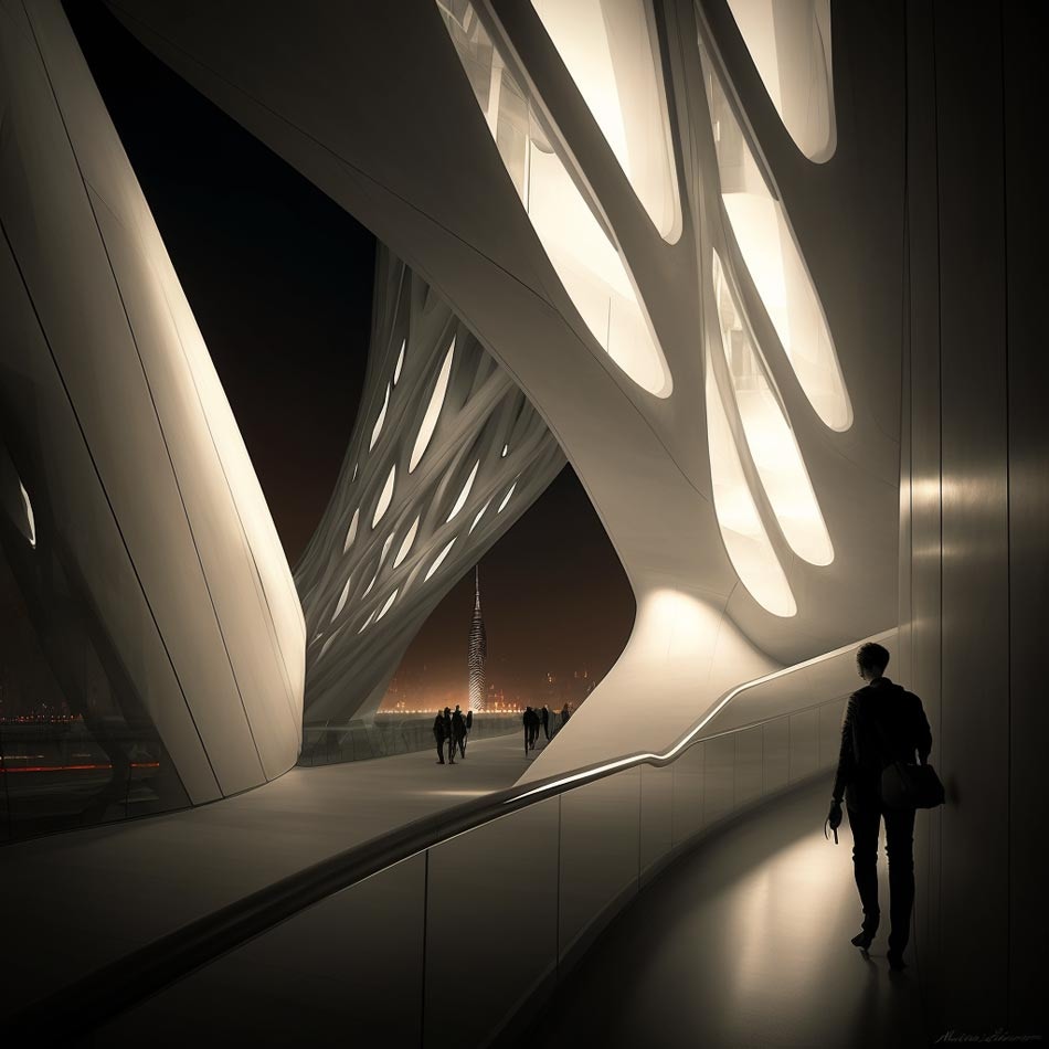 prompt: architectur design, zaha hadid style, maxx museum viewing a city, a few visitors at the entrance, award winning, 8K, hyperrealistic,sony camera, award winning photo, magazin photograph, 50mm with 2.8, perfect lighting in the evening --ar 16:9 --v 5 @Subraum-01 (fast)