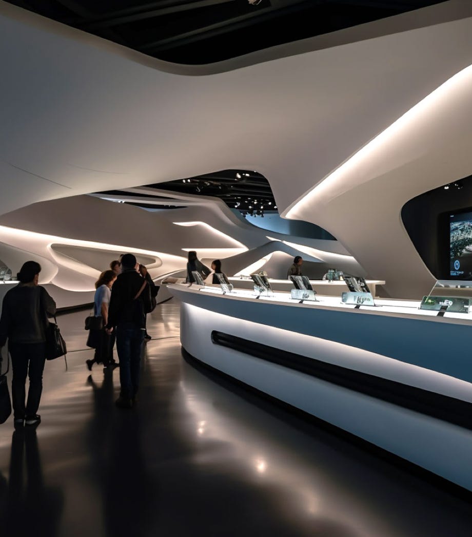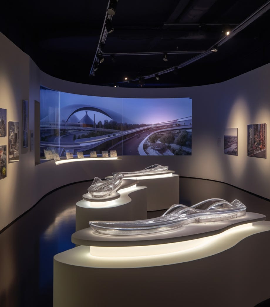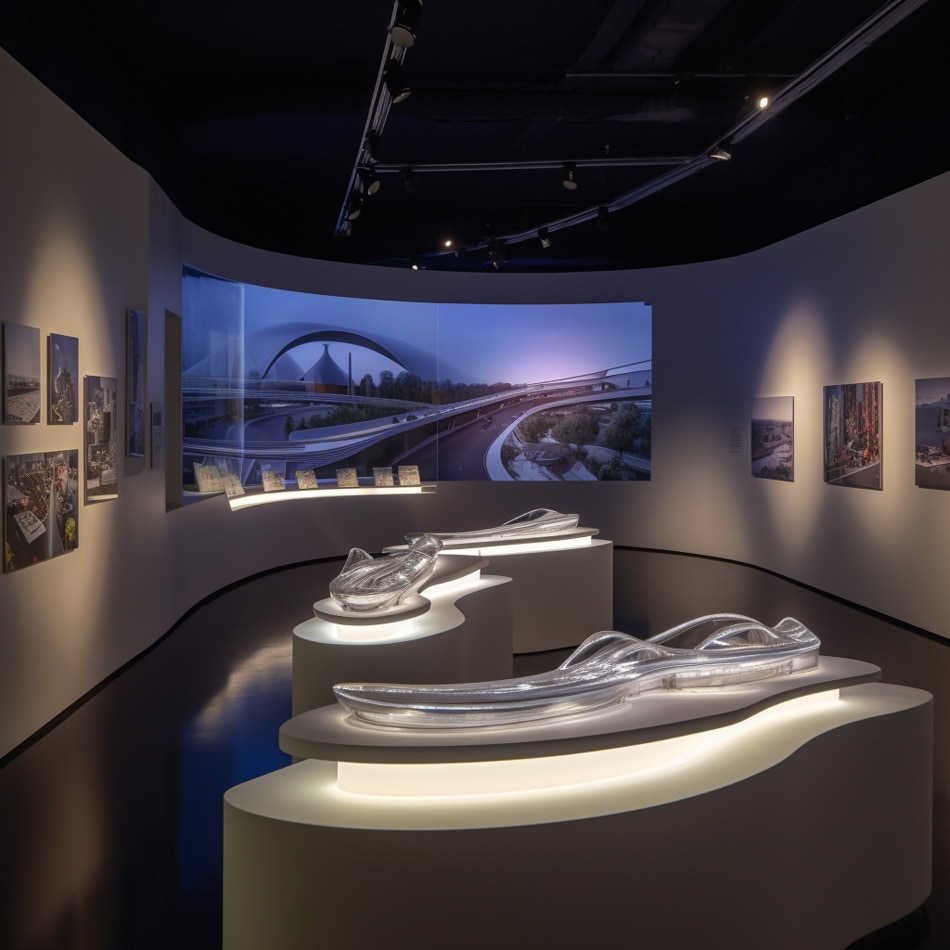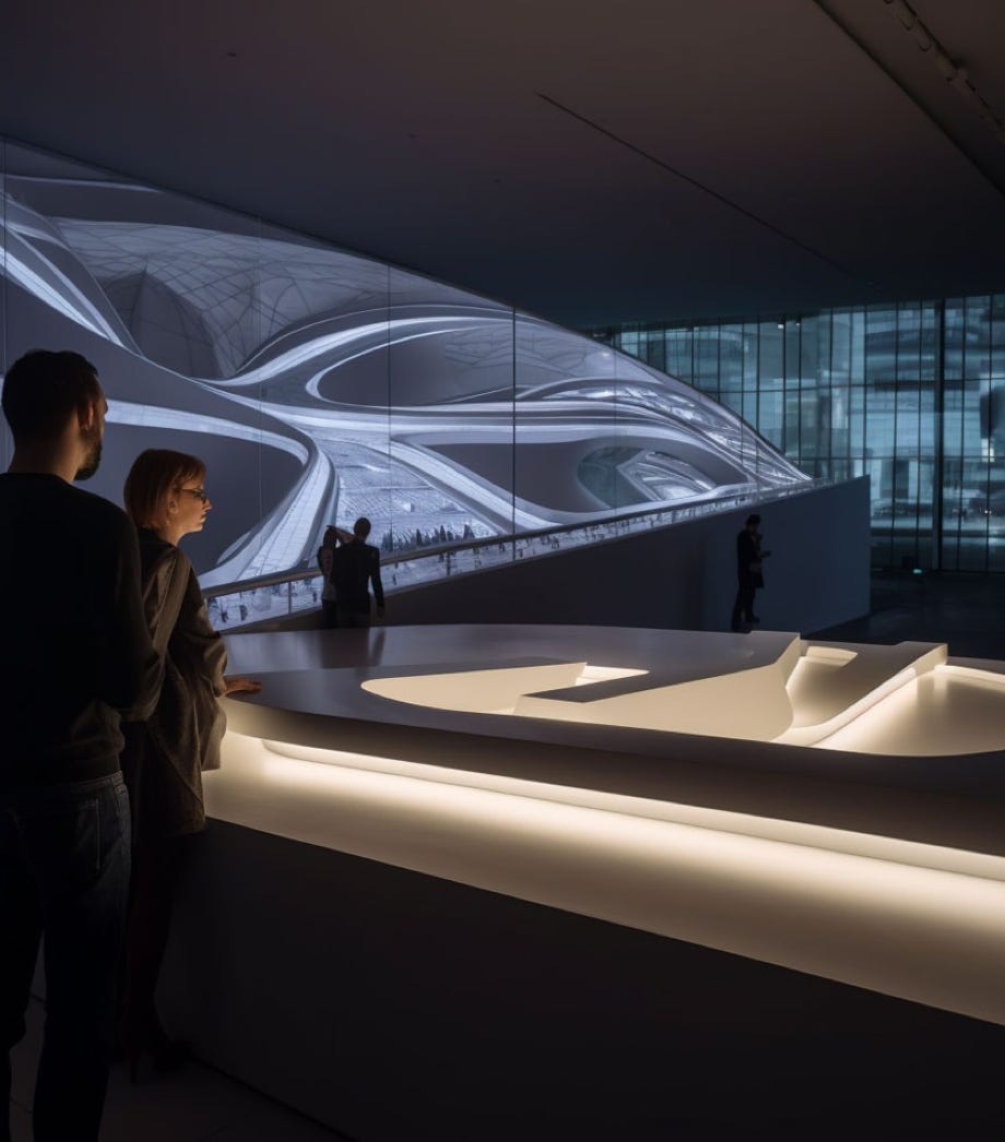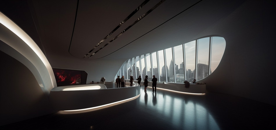 prompt: architectur design, zaha hadid style, maxx museum viewing a city, a few visitors at the entrance, award winning, 8K, hyperrealistic,sony camera, award winning photo, magazin photograph, 50mm with 2.8, perfect lighting in the evening --ar 16:9 --v 5 @Subraum-01 (fast)