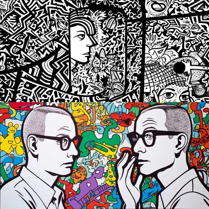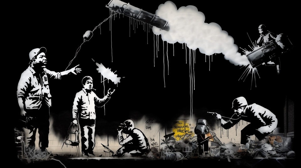prompt: peter fischli & david weiss artwork, "Did something go terribly wrong shortly after the Big Bang?", art style, Banksy style, Street Art, graffity, isolated on a BLACK background, high contrast, sprayer technique, intricate details. --ar 16:9 --v 5 - Image #2 @Subraum-01