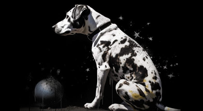 prompt: peter fischli & david weiss artwork, "What is my dog thinking?", art style, Banksy style, Street Art, graffity, isolated on a BLACK background, high contrast, sprayer technique, intricate details. --ar 16:9 --v 5 - Image #3 @Subraum-01