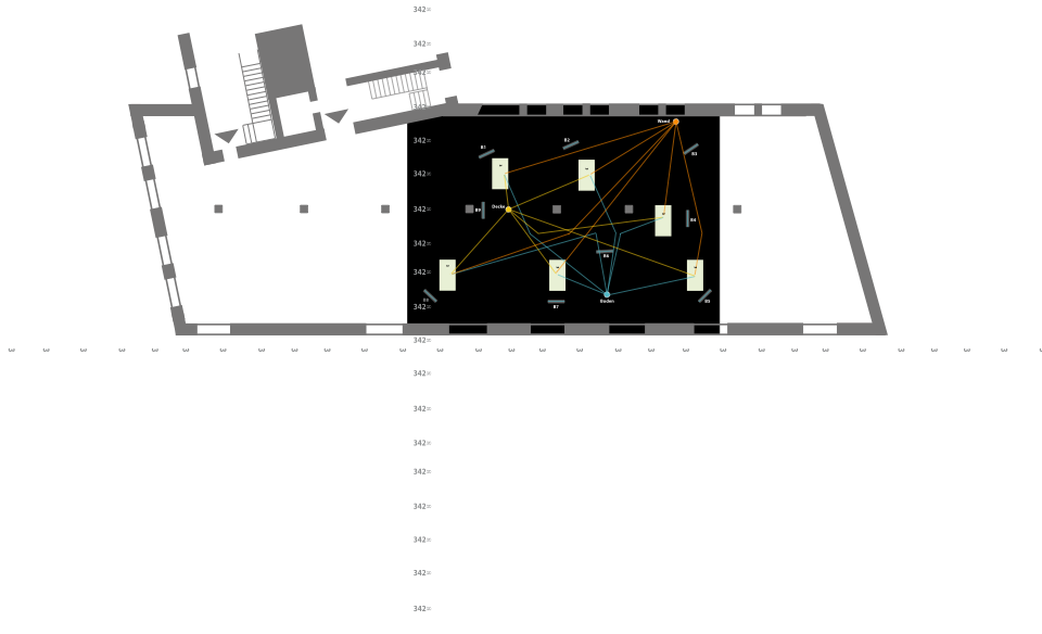 Um eine kognitive Landkarte zu evozieren, versucht die Rauminstallation einen dissoziierten Blick auf die Situation zu vermitteln.