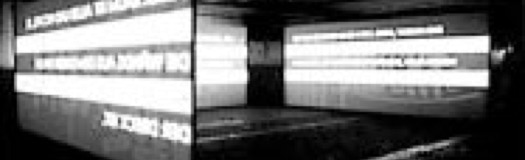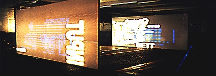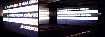 Der virtuelle Raum durchdringt den realen und erweitert ihn ins Unendliche. Ferne Orte/Räume werden in Worte gefasst, aufgelöst und gelangen über das Internet in den realen Raum. Starre Wände werden durch Projektionen aufgelöst und öffnen sich zu neuen, tieferen Ebenen.