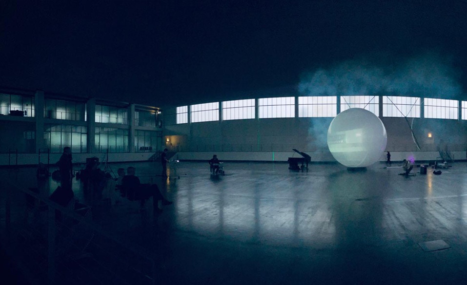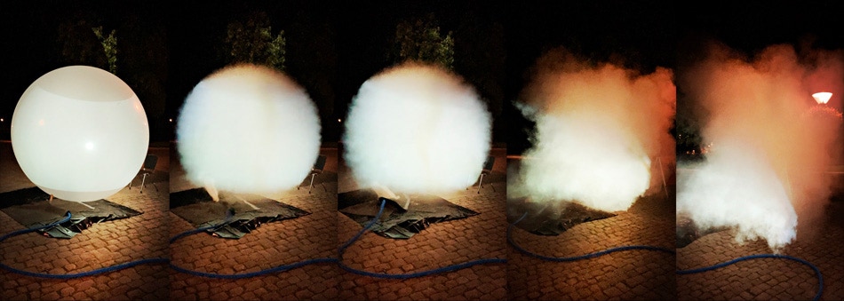 Bei dieser Installation handelte es sich um eine Versuchsanordnung, bei der ein Luftballon auf einen Durchmesser von ca. 6,0 m aufgeblasen und zum Platzen gebracht wurde. Ziel war es, nicht nur eine kugelförmige weiße Wolke zu erzeugen, sondern auch eine Rauminstallation im wunderschönen Hangar 21.