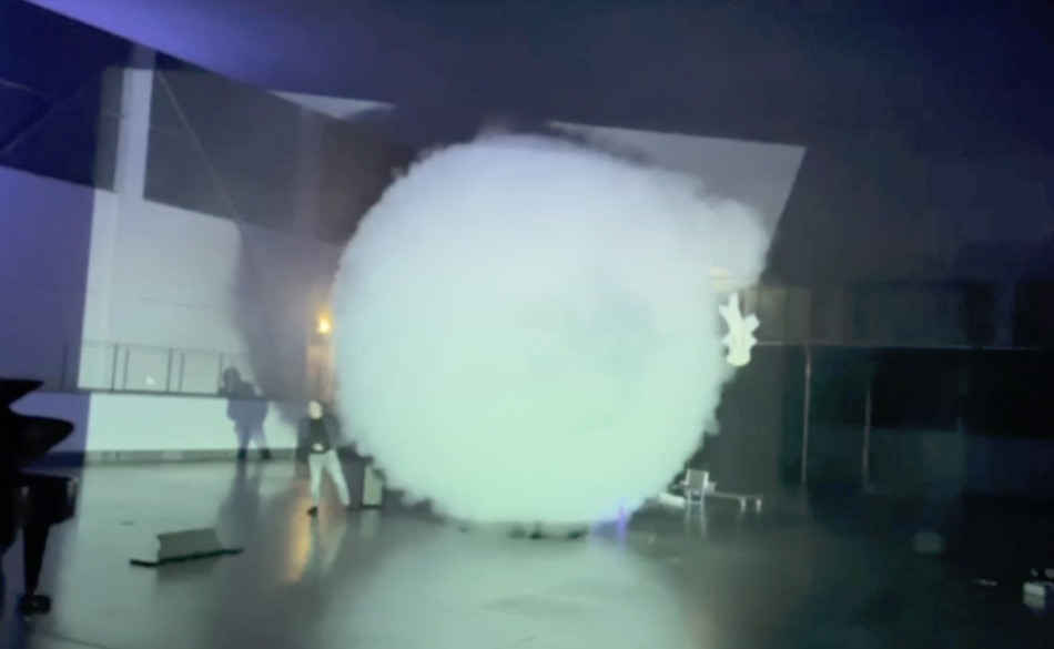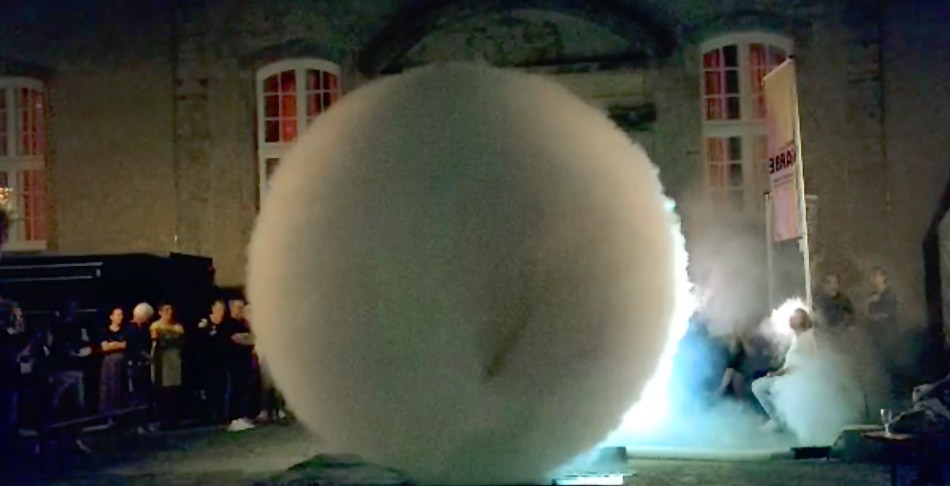 Für die Eröffnungsveranstaltung haben wir einen Ballon auf ca. 4,0 m Durchmesser aufgeblasen und zum Platzen gebracht. Es entstand eine temporäre, nach Vanille duftende, kugelförmige Wolke, die alle Besucher einhüllte und sich langsam auflöste.