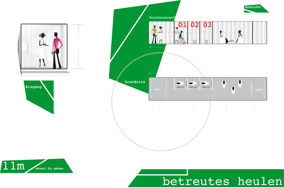 Unsere Idee sind weiße, weich gepolsterte Container, die an den Spielorten aufgestellt werden. Geschultes Personal hält speziell gepolsterte Schultern zum Ausweinen bereit. Heulbäume laden zum Festhalten ein und eine internationale Tränenbank dokumentiert und speichert die Tränenströme in Ampullen.