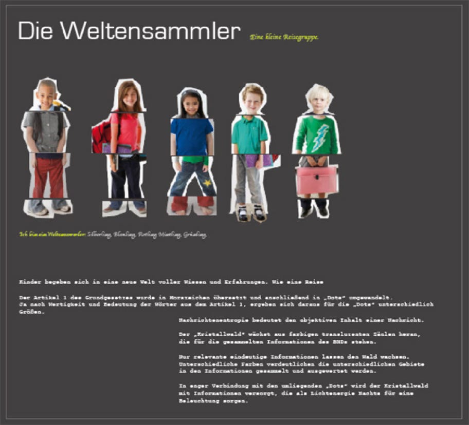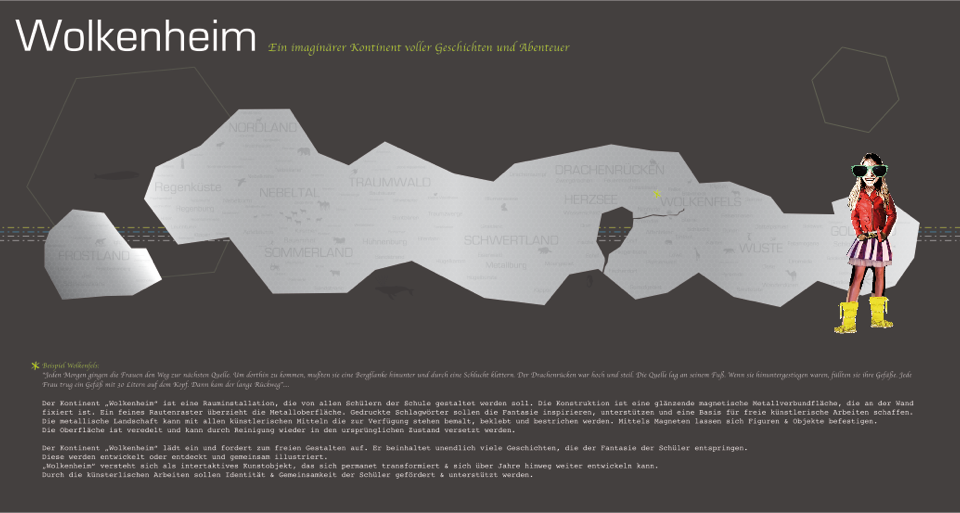 Der Kontinent „Wolkenheim“ lädt ein und fordert zum freien Gestalten auf. Er beinhaltet unendlich viele Geschichten, die der Fantasie der Schüler entspringen. Diese werden entwickelt oder entdeckt und gemeinsam illustriert. „Wolkenheim“ versteht sich als interaktives Kunstobjekt, das sich permanent transformiert & sich über Jahre hinweg weiter entwickeln kann.