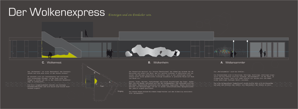 Die zukünftige Schule und die Historie des Standortes formulieren gemeinsam die Elemente für ein Kunstobjekt, das Beziehungen zwischen Vergangenheit und Zukunft aufzeigt und vergangenes wieder sichtbar gestaltet. Spuren durchdringen das Gebäude. Sie nehmen Kontur an auf den Wänden und formen das Foyer. Entlang der Spuren befindet sich der imaginäre Kontinent „Wolkenheim“, den die Schüler mit ihren Fantasien bereisen und gestalten sollen.